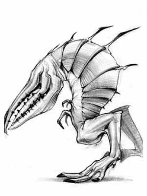 What little concept art exists of Meeches shows them as having multiple jaws, tiny forearms, and two hind legs that could potentially make Meeches very fast. Meeches were brown and stood about 3·5–4 feet (1–1·2 m) tall on two three-toed legs. Red stripes ran across their armour-plated back, which had large spikes running down their spine.